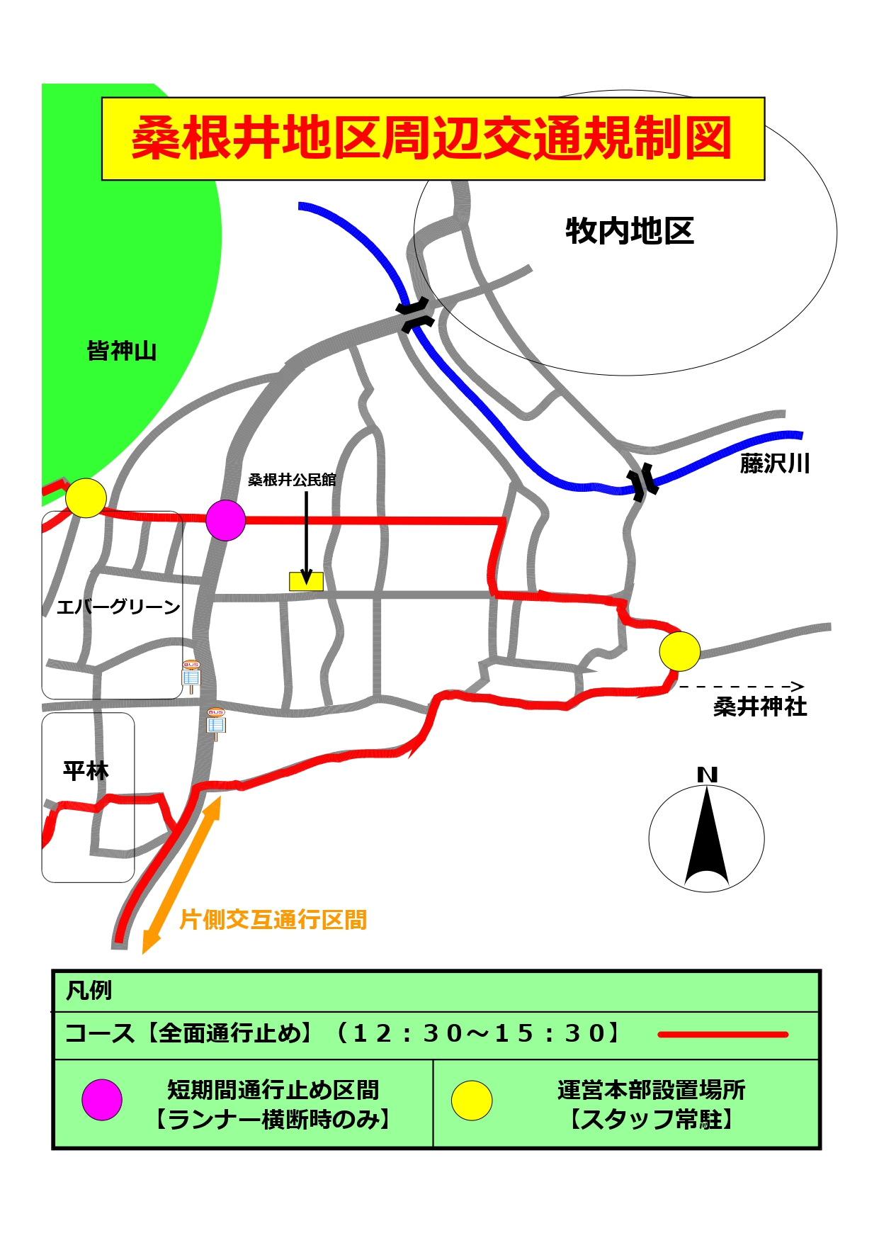 原則、12時30分~15時30分まで(大会の進行具合によっては若干の変更もございますが、12時30分以前・15時30分以降は通常通り通行が可能です)