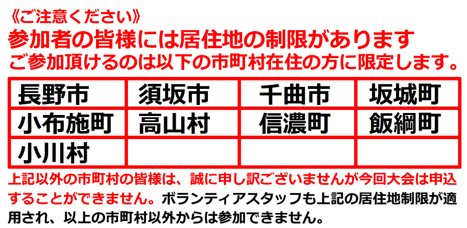 主催者としては、大変苦渋の決断ではありますが、新型コロナウイルス感染拡大防止と開催可否の判断を円滑に行うため、参加者の居住地制限を設けます。申込ができない市町村の方には、誠に申し訳ありませんがご理解頂きますようお願い致します。